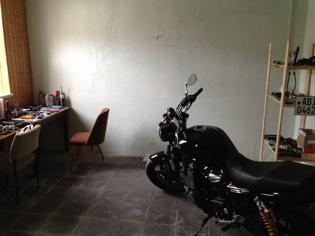 Über die Jahre haben sich meine Örtlichkeiten und Möglichkeiten des Schraubens an Motorrädern entwickelt. Es fing an mit einer einfachen Garage. Es gab keinen Strom, kein Licht, keine Heizung, keine Einrichtung und viel Dreck.