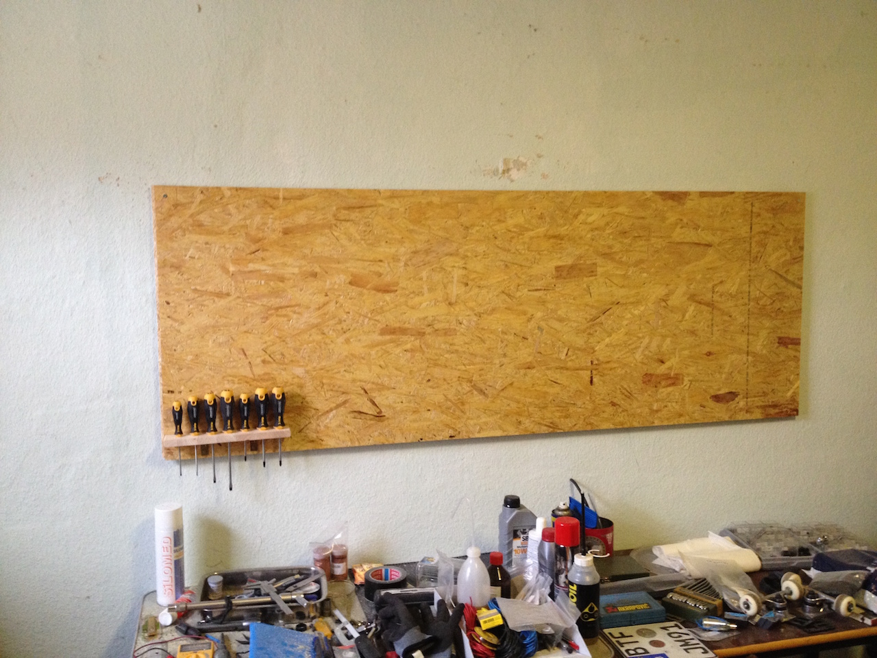 Um mein Werkzeug endlich mal vernünftig unterbringen zu können habe ich eine OSB Platte an die Wand gehängt und nach und nach Haken eingedreht. So findet alles irgendwann seinen Platz. Nagut, vieles muss nach wie vor auf den Tischen liegenbleiben. Vielleicht bau ich mir irgendwann nochmal einen Werkzeugwagen.