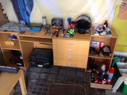 Im Raum nebenan habe ich mir aus einer alten Eisenbahnplatte einen Sägetisch gebaut. Der muss aber beim Schrauben auch oft als Teilezwischenlager herhalten ;-)