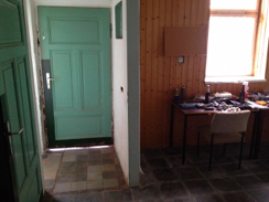 Das fand ich dann gleich auf dem Grundstück daneben. Im Büroraum einer ehemaligen Schlosserei durfte ich mich einrichten. Der Besitzer hat mir freundlicherweise nach der Entrümplung sogar noch zwei Tische und Stühle drinnen stehengelassen. Vielen Dank. Da habe ich direkt erst mal mein Zeug drauf gelegt. Mein kurz vorher angeschafftes Regal ist natürlich mit umgezogen.